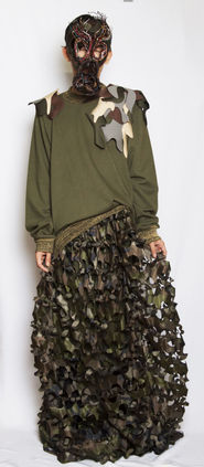 Camouflage, in neoprene, parachute silk and plastic, is bombed with embellishments, to signify the triumph of the human spirit in the face of adversity